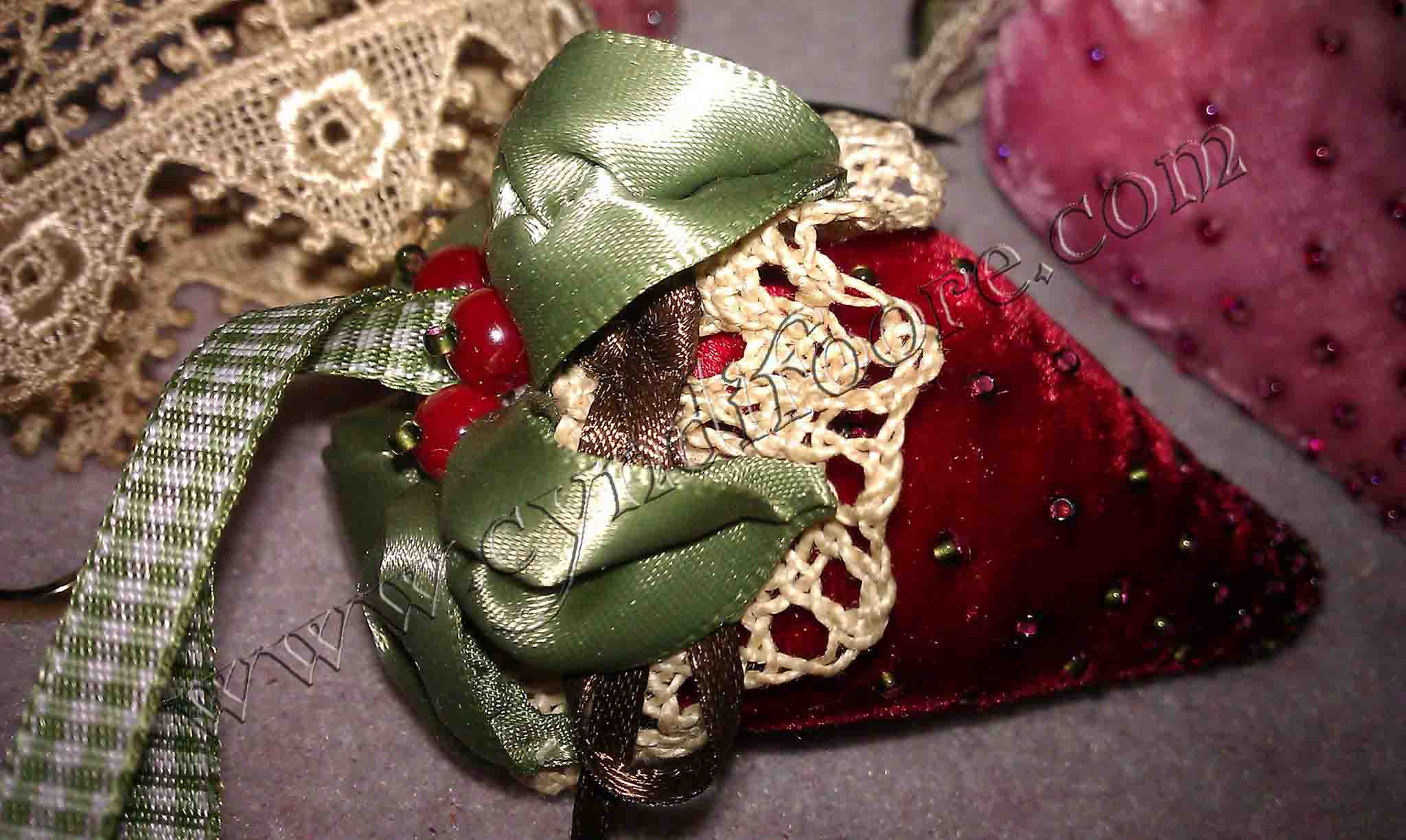 My strawberry emeries are unique and one of a kind. I use only the highest quality fabric, threads, ribbon, beads and lace. Some of them will look antique and others will look fresh and new. Most are made of hand dyed velvet but I do have some vintage fabrics and brocades that will be used to make some beauties as well. I make each with love and I have a wide variety of colors to choose from. Put an order in for one or more today. Make sure you order early to receive them for a special day such as a birthday, Mother's Day, Easter or Christmas. The ones pictured are $25. I recently got some vintage ribbons and lace, and strawberries made with vintage materials will be even more unique and priced accordingly.